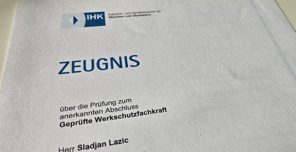 Im Sommer 2002 absolvierte ich die Werkschutzlehrgänge I und II beim Bayerischen Verband für Sicherheit in der Wirtschaft (BVSW). Diese Qualifizierungen waren für den Einsatz im Werkschutz wichtig und wirkten sich auch auf die tarifliche Bezahlung aus. Gleichzeitig eröffneten sie weitere Entwicklungsmöglichkeiten innerhalb des Sicherheitsdienstes.